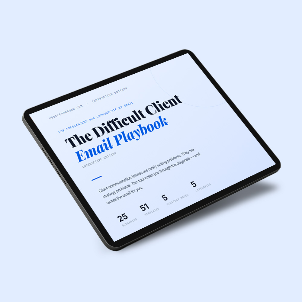 - The Difficult Client Email Playbook (P-001) — 25 scenarios for boundary enforcement, de-escalation, and managing clients who push limits. From micromanagers to ghosters.