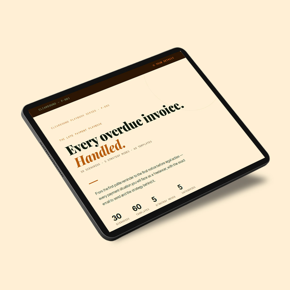 - The Late Payment Playbook (P-003) — 30 scenarios covering the full escalation ladder, from a gentle first nudge to the final notice before collections. Late fee clause scripts included.