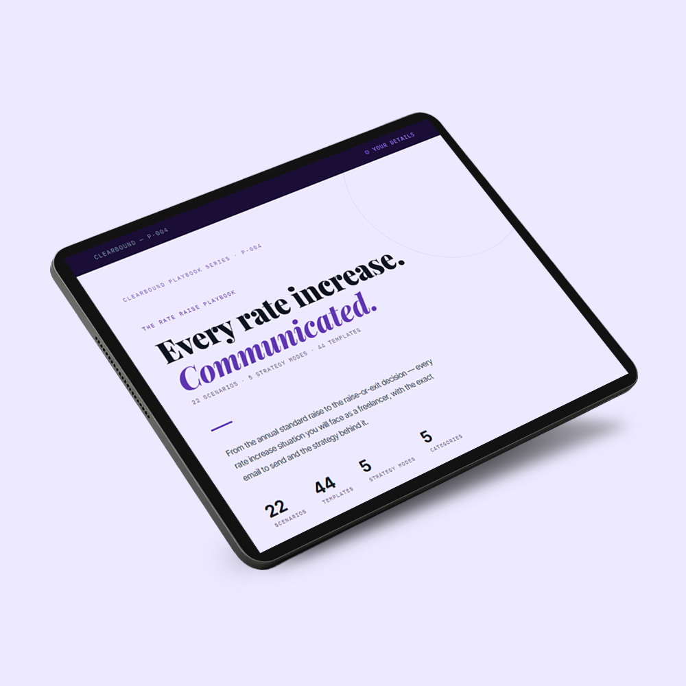 - The Rate Raise Playbook (P-004) — 22 scenarios for raising rates with existing clients. Covers pushback, negotiation, silence, and every awkward moment in between.